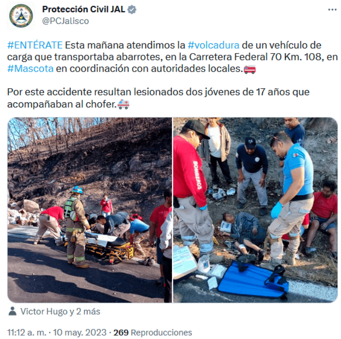 Apenas esta mañana se reportaba un accidente en la autopista Guadalajara - Tepic que dejó una mujer muerta y nueve lesionados, cuando este mismo día, pero en la Carretera Federal 70, en Mascota, se reportó la volcadura de un vehículo de carga que dejó dos personas lesionadas.Fue Protección Civil Jalisco quien, a través de su cuenta de Twitter, informó de los hechos a la altura del kilómetro 108, en Mascota, de la mencionada vía que el vehículo que transportaba abarrotes se volcó. Por el accidente resultaron heridos dos jóvenes de 17 años que acompañaban al chofer.En las imágenes que también se compartieron se observa al camión volcado, mientras cuerpos de emergencia y rescate asisten a los lesionados. En menos de una semana, dos accidentes han acaparado la atención de las autoridades y de la ciudadanía. El primero, el pasado 4 de mayo, sucedió en la autopista Jala - Compostela, la vía corta a Puerto Vallarta, donde un camión que transportaba flores también se precipitó por un barranco de aproximadamente 20 metros, lo que dio como resultado que nueve personas perdieran la vida y otras más resultaran heridas.Hoy, por la madrugada, un camión que trasladaba a un equipo de futbol infantil a Mazatlán, junto a sus familiares, se accidentó en la autopista Guadalajara - Tepic, sin que hasta el momento se conozcan las causas que lo originaron, pero el saldo mortal es de una mujer muerta y varios heridos, solo uno de gravedad.Con el de hoy, en la carretera libre a Puerto Vallarta suman tres accidentes carreteros en menos de una semana.OA
