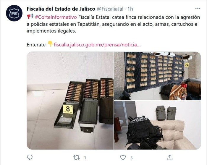 Luego del enfrentamiento ocurrido ayer jueves en el municipio de Tepatitlán, en el cual un policía estatal fue asesinado, la Fiscalía de Jalisco cateó una finca presuntamente relacionada con los hechos, en la cual se encontró armamento y equipo táctico, entre otros indicios.Esta acción, dijo la dependencia, fue llevada a cabo por efectivos de la Fiscalía regional, quienes implementaron un cateo en la vivienda localizada en la calle Del Archiduque número 1590, en la colonia Lomas del Real, a partir de una orden obsequiada por un Juez de Control y Oralidad.Ahí las autoridades aseguraron varias armas de fuego cortas, fornituras, insignias, cartuchos útiles de diversos calibres, entre ellos 295 antiblindaje calibre .50 y varios cargadores.También hallaron mochilas, chalecos tácticos y balísticos con placas, portacargadores, un casco balístico, gorras, guantes, un radio portátil y 17 mil 670 pesos, así como un águila y un oso negro disecados, un colmillo blanco de gran magnitud y dos pieles de león y de ocelote, entre otros objetos.La dependencia estatal informó que además se pudo asegurar un automóvil Nissan Sentra modelo 2021, con placas de circulación de Jalisco sobrepuestas.Continuando con el despliegue de seguridad durante la noche, los agentes de la Fiscalía regional de Tepatitlán también lograron el aseguramiento de una camioneta Ford Lobo color negro, modelo 2021 con placas sobrepuestas del Estado de Puebla, en la cual se encontraron dos armas largas con sus respectivos cargadores, una de ellas abastecida y dentro dos casquillos, y otros tres en la caja, la cual se presume fue utilizada en el ataque.El vehículo fue hallado sobre el kilómetro 23 de la carretera Tepatitlán–Tototlán, a la altura del Rancho de Fátima, en Tepatitlán.Esta unidad, dijo la Fiscalía, cuenta con reporte de robo del 12 de mayo del 2020 y al momento del hurto era de color blanca.Se desprende de las indagatorias que el jueves los elementos de la Policía del Estado llevaban a cabo revisiones para detectar automotores con reporte de robo y uno arrojó positivo.Sin embargo, varios sujetos “que los superaban en número” comenzaron a dispararles de diversos ángulos, además de que otros tres individuos bajaron de una camioneta pick up doble cabina, los cuales también los atacaron a balazos.“A la par de lo anterior otro grupo de hombres armados que se encontraban en la vivienda de la calle Archiduque 1590, salieron del sitio y también accionaron contra los oficiales”, dijo la Fiscalía, pero no informó sobre alguna detención al respecto.La dependencia aseguró que continuará realizando acciones conjuntas y coordinadas con las diversas autoridades, para lograr la aprehensión de los agresores para presentarlos ante la justicia y que respondan por sus actos.JM
