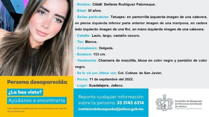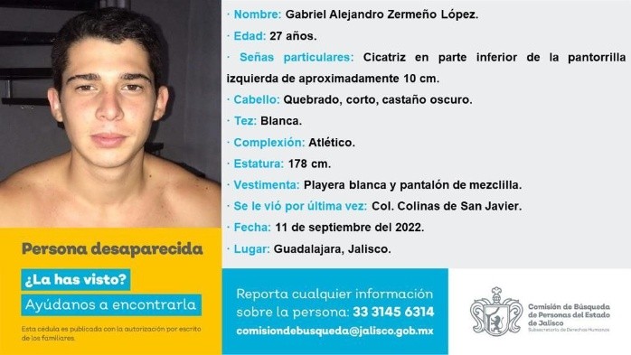 Los familiares de dos jóvenes novios en Guadalajara, Jalisco, emitieron una ficha de búsqueda para localizarlos, pues se encuentran desaparecidos.El primero de ellos es Gabriel Alejandro Zermeño López, de 27 años, quien tiene una cicatriz en la parte inferior de la pantorilla.El joven mide 1.78 metros de estatura, es de tez clara y vestía una playera blanca con pantalón de mezclilla la última vez que fue visto, en la colonia Colinas de San Javier en Guadalajara.La segunda persona desaparecida es Citlali Estefanía Rodríguez Palomeque, de 30 años, quien según las primeras versiones es pareja de Gabriel Alejandro.Al igual que su novio, fue vista por última vez en la colonia Colinas de San Javier en Guadalajara. Citlali es una influencer de estilo de vida saludable.La joven tiene 24.7K seguidores y varios tatuajes como uno de calavera con flores, una mariposa y una rosa. Sus familiares la buscan desde hace seis días.OA