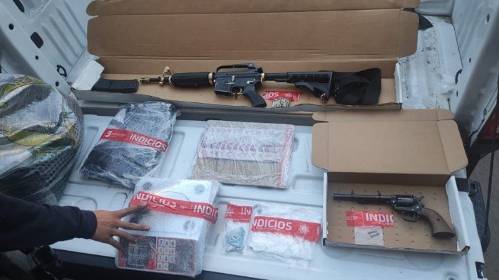 La Comisaría de Guadalajara informó que detuvo a dos hombres con armas, una de ellas chapada en oro, así como distintos tipos de droga. Los policías de la Unidad para la Recuperación del Estado de Derecho y la Paz (UREPAZ) informaron que patrullaban en las inmediaciones de Avenida Inglaterra y Niños Héroes, cuando vieron a dos hombres, uno de ellos con un chaleco antibalas y el otro que cargaba un costal.Señalaron que les marcaron el alto y cuando los inspeccionaron les hallaron un arma larga aparentemente calibre .223 chapada en oro, y una bolsa con cerca de cinco kilos de presunta mariguana. También les encontraron un revólver aparentemente calibre .22, dos tiros útiles, cerca de 600 pesos en efectivo, alrededor de 22 envoltorios con presunto "crystal", cinco envoltorios con vegetal verde, el chaleco antibalas y una báscula gramera. Los hombres detenidos se identificaron como Miguel Antonio “N”, de 43 años y Jorge Antonio “N”, de 35 y fueron llevados ante el Ministerio Público (MP).Cabe mencionar que Jorge Antonio “N” cuenta con antecedentes penales por los delitos de robo, amenazas de muerte y robo de autopartes, y ha sido detenido por lo menos en seis ocasiones previas desde 2008. La última vez fue en 2020 por amenazas de muerte. MS