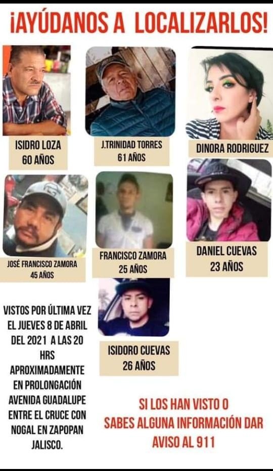 Ahora son cuatro integrantes de una familia quienes se encuentran desaparecidos desde el pasado jueves 08 de abril, cuando se les vio por última vez en la colonia Balcones del Sol, en Zapopan.Se trata de los hermanos Daniel Cuevas Sánchez e Isidoro Cuevas Sánchez, así como de su primo José Francisco Zamora Sánchez y su tío José Francisco Zamora Moreno, quienes fueron privados ilegalmente de la libertad por hombres armados la noche de ese jueves mientras convivían afuera del domicilio de sus abuelos, ubicado en la calle Privada Toronja."Estaban ellos con sus esposas conviviendo afuera de la casa con más familiares. Como entre las 7:30 y las 8:00 de la noche llegaron entre tres a cuatro camionetas y solo los subieron a ellos y a las mujeres les dijeron que se metieran a la casa, pero desde ahí no se sabe nada ni nos han marcado para ver si quieren algo a cambio", dijo uno de sus familiares.Por la desaparición de estas cuatro personas su familia acudió a la Fiscalía Estatal la mañana del viernes 07 de abril a interponer las denuncias correspondientes, abriendo así el expediente de investigación bajo el número 24666/2021."El hecho fue visto, no es como que se fueron y no regresaron, se los llevaron hombres armados. De hecho aventaron algunos balazos al aire. Uno de de ellos trató de forcejear para que no se lo llevaran y lo lastimaron, solo esperamos que estén bien", añadió el familiar.Su desaparición ocurrió a dos cuadras de diferencia de donde fue vista por última vez la abogada Irasema Dinora Rodriguez, de 41 años, de quien la Comisión de Búsqueda del Estado compartió, la tarde de este domingo, una ficha para pedir ayuda en su localización.De acuerdo con la información preliminar, Dinora había acudido con otros dos hombres, Trinidad Torres e Isidro Loza Peña, a realizar algunos trámites respecto de un terreno ubicado en Prolongación Guadalupe y Nogal, cuando también fueron privados de la libertad por varios hombres armados.Hasta el momento la Fiscalía Estatal no ha confirmado si existe alguna denuncia por la desaparición de Trinidad e Isidro, pero en redes sociales son buscados por sus familiares. En total serían al menos siete las personas privadas de la libertad ese jueves."Parece que primero se llevaron a mis familiares y después a las otras tres personas. Ese terreno que ellos al parecer iban a ver está enfrente de la casa de mis familiares, donde estaban conviviendo. Ellos no tenían nada que ver con el terreno, no queremos decir que estaban en un lugar equivocado, porque es casa de la familia pero como que los confundieron pensando que lo estaban cuidando o no sé, pero de ellos unos trabajan como conductores de taxis ejecutivos y otros de albañiles, quienes se los llevaron pueden comprobarlo. Solo queremos que nos los devuelvan pronto y con bien", finalizó el familiar de las víctimas.LS
