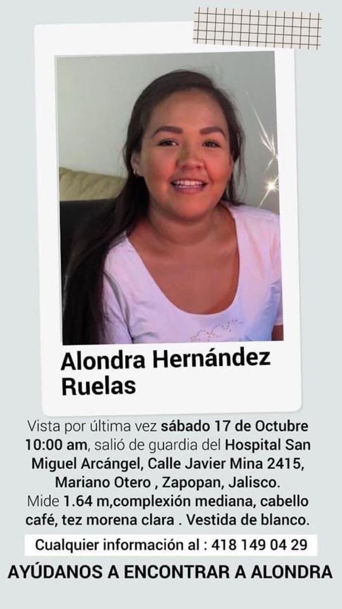 Tras la ola de reportes sobre la desaparición de la doctora Alondra Hernández Ruelas el pasado sábado 17 de octubre al salir de su trabajo en Zapopan, la Fiscalía de Jalisco confirma que ya investiga el casoAlondra Hernández Ruelas fue vista por última vez al salir de su guardia en un hospital de la colonia Mariano Otero, en Zapopan, según los mensajes en redes sociales que usan el hashtag #TeBuscamosAlondra.Este lunes 19 de octubre, familiares de Alondra Hernández acudieron a la Fiscalía Especial en Personas Desaparecidas de Jalisco para hacer la denuncia correspondiente.De acuerdo a su ficha que se difunde, Alondra mide un 1.64 metros, tiene tez morena clara y ojos color café. Su cabello es largo, lacio y negro y como seña particular tiene una cicatriz arriba de la ceja izquierda.Alondra Hernández, de 25 años de edad, se trasladaba a bordo de un auto Honda con placas con placas VBJ-734-A de San Luis Potosí, que tampoco ha sido localizado.Tras recibir la denuncia por parte de familiares, la Fiscalía de Jalisco inició con los protocolos correspondientes para la búsqueda y localización de la joven Alondra Hernández Ruelas.De igual manera, se solicita a la población en general que si cuentan con información que pueda aportar datos a la investigación sobre la desaparición de la médico Alondra Hernández, se comuniquen a los teléfonos 33 3738 6000 Ext: 12115 y 12116.