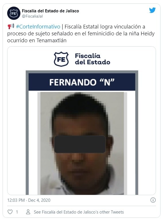 El 15 de noviembre la niña Heidy acudió a la tienda y ya no regresó, por lo que sus familiares comenzaron a buscarla. Poco después fue localizada sin vida, semienterrada y presentaba huellas de violencia.La práctica de la necropsia se estableció como causa de muerte asfixia por estrangulación directa.Ante ello, la Fiscalía del Estado logró la vinculación a proceso de Fernando “N” y prisión preventiva por un año, ya que es señalado como el probable autor del asesinato de la menor y de quien era tío, ocurrido el pasado 19 de noviembre en el municipio de Tenamaxtlán.Entre los datos de prueba que fortalecieron la teoría del delito, según informó la Fiscalía, se encuentran que el día de los hechos Fernando “N” estuvo con su sobrina e incluso se les vio paseando en la moto del individuo.En la audiencia de imputación por el delito de feminicidio, el agente del Ministerio Público demostró que el imputado aprovechó la confianza que la niña le tenía para realizar actos de dominio y poder sobre ella.NR