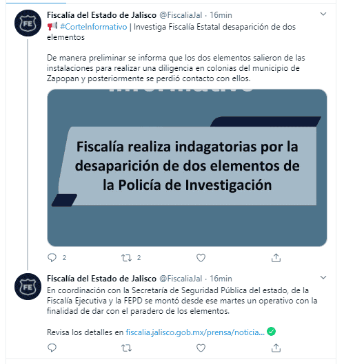 La Fiscalía del Estado informó este jueves sobre el reporte de desaparición de dos elementos de la Policía Investigadora, de quienes se desconoce su paradero desde el pasado martes, situación que ya es investigada por la dependencia.De acuerdo de la Fiscalía, se sabe que los dos elementos se encontraban cubriendo su turno cuando salieron de las instalaciones de la Fiscalía Estatal para realizar una diligencia en colonias del municipio de Zapopan y posteriormente se perdió contacto con ellos.Por ello, personal del área comenzó a realizar una búsqueda en diversos puntos de la ciudad con la finalidad de localizarlos, sin que hasta el momento se tenga información sobre su paradero.Al no poder establecer comunicación con ellos, familiares de ambos policías acudieron ante la Fiscalía Especial en Personas Desaparecidas (FEPD) para presentar la denuncia correspondiente, por lo que se dio inicio al protocolo de búsqueda a fin de lograr su localización.De manera extraoficial se supo que ambos elementos se encontraban en investigación en la colonia Jardín Real, en Zapopan, y que viajaban en un auto compacto perteneciente a la Fiscalía, hasta que se perdió comunicación con ellos.“En coordinación con personal de la Secretaría de Seguridad Pública del estado, de la Fiscalía Ejecutiva y la FEPD se montó desde este mismo martes un operativo en diversas colonias de Zapopan, con la finalidad de obtener datos de prueba que permitan dar con el paradero de los elementos”, indicó la dependencia a través de un comunicado.NR