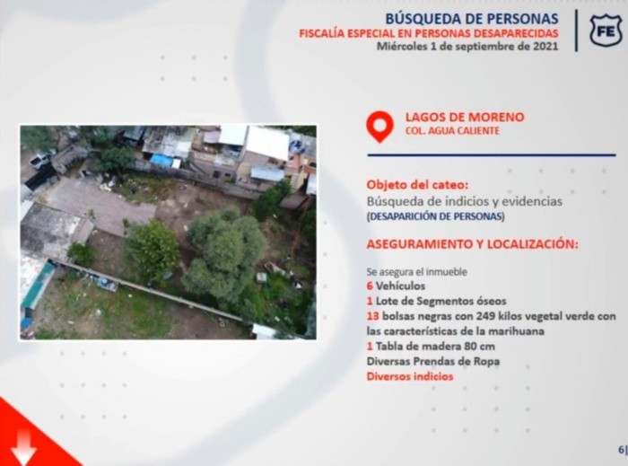 Este martes el fiscal del Estado, Gerardo Octavio Solís, informó que, a partir de un cateo llevado a cabo para la búsqueda de indicios y evidencias sobre desaparición de personas, fue localizado un predio en el municipio de Lagos de Moreno donde encontraron restos óseos y varias bolsas de, al parecer, marihuana.El predio, dijo, fue ubicado este miércoles en la colonia Agua Caliente gracias a las labores de la Fiscalía Especializada en Personas Desaparecidas.Ahí se encontraron al menos un “lote de segmentos óseos”, así como 13 bolsas con 249 kilos de vegetal verde, al parecer marihuana, una tabla de madera de 80 centímetros y diversas prendas de ropa.En el cateo, dijo, se logró también el aseguramiento de seis vehículos, entre ellos varias camionetas tipo pickup, pero no hubo ninguna persona detenida.Mientras la Fiscalía Estatal continuará con las averiguaciones respecto a la desaparición de personas, se le dará vista a la Fiscalía General de la República para que inicie las averiguaciones correspondientes respecto del hallazgo de la droga.Por otra parte y también relacionado con la desaparición de personas, el fiscal confirmó que fue interpuesta una denuncia por la desaparición de dos personas en el municipio de Teocaltiche el pasado domingo, y aseguró que ya se trabaja en la localización de las víctimas.“Se está trabajando con los familiares, manifiestan de entrada que salieron y perdieron contacto con ellos. Ahí personal ya ha estado trabajando en el interior del Estado en diversos asuntos, entre ellos este. En cuanto tengamos otros datos que podemos informar así lo haremos se su conocimiento”, añadió el Fiscal.Si te interesó esta noticia y quieres saber más, entonces descarga y descubre INFORMAPlus, la aplicación digital de EL INFORMADOR, en donde tenemos contenidos exclusivos, seleccionados por nuestros editores, para darles una experiencia más completa a los lectores.Descarga la aplicación y pruébala GRATIS por treinta días.Para iOS: https://apple.co/35jaVgbPara Android: https://bit.ly/3gwVSEVSi eres suscriptor de EL INFORMADOR tu acceso está incluido, solicítalo al 33 3678-7777GC