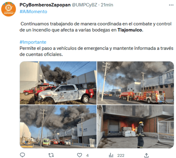 La mañana de este miércoles 12 de abril se registra un incendio en una zona industrial de Tlajomulco.Alrededor de 60 elementos de Protección Civil y Bomberos de Tlajomulco, con el apoyo de Protección Civil Jalisco, de Guadalajara, Zapopan y Tlaquepaque, trabajan en sofocar un incendio en dos bodegas ubicadas en el condominio industrial de Santa Cruz, en López Mateos Sur.De acuerdo con las autoridades, Servicios Médicos Municipales se encuentra atendiendo a bomberos que presentan fatiga.Las autoridades recomiendan a la población no acercarse al área siniestrada y seguir atentos a las indicaciones de Protección Civil y Bomberos.OA