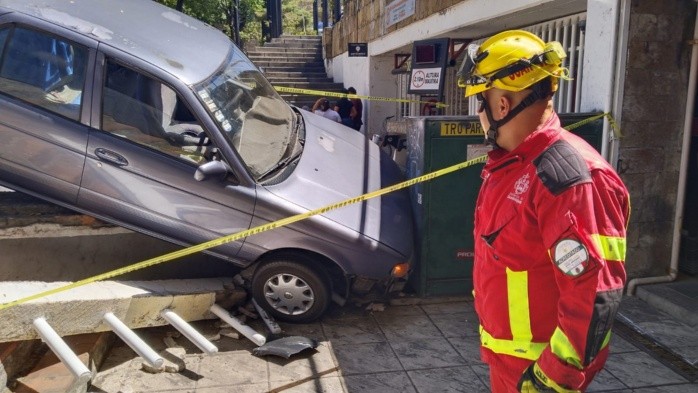 Una conductora resultó lesionada luego de que sufriera un accidente al intentar ingresar a un estacionamiento ubicado en el Centro de Guadalajara.Personal de Bomberos Guadalajara informó que la tarde de este lunes atendieron un reporte de una mujer de 44 años años que conducía un auto Tsuru y que chocó contra un transformador en el ingreso de un estacionamiento subterráneo que se localiza entre República y Paseo Cabañas.La mujer señaló que perdió el control y cayó en el auto a una altura de aproximadamente un metro y derribó un muro de contención.La conductora resultó con lesiones en la pierna izquierda y fue atendida en el lugar.