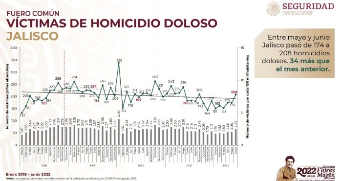 Al interior de un lote baldío, el martes fueron encontrados los cuerpos de cuatro hombres con visibles huellas de violencia. De acuerdo con la Fiscalía del Estado, a simple vista se les apreciaban varias heridas de bala.Los cadáveres se hallaban al interior de un lote baldío ubicado en el cruce de las calles Zalate y La Noria, en el municipio de La Cofradía, en Tlaquepaque.Pese a los anuncios sobre la baja en la incidencia delictiva en Jalisco, basado en el bajo número de denuncias presentada ante las autoridades, los asesinatos no dan tregua.De hecho, durante el último mes los homicidios dolosos incrementaron, posicionando al mes de junio como el más violento hasta ahora del primer semestre de 2022, con un total de 208 víctimas, según el Informe de Seguridad presentado por la secretaria de Seguridad y Protección Ciudadana del Gobierno federal, Rosa Icela Rodríguez.El pasado 21 de junio EL INFORMADOR dio a conocer que abril y mayo habían sido los meses de 2022 con más homicidios en Jalisco, con 175 asesinatos cada uno. Este miércoles, mayo aparece con un asesinato menos, sumando 174.Con las 208 víctimas de junio, el Estado se mantiene en el quinto lugar nacional con más homicidios dolosos, sumando hasta hoy mil 024 asesinatos en el primer semestre del año.Tampoco ha logrado salir del top de seis entidades que concentran la mitad de todos los asesinatos ocurridos en el País en lo que va del año. Las otras cinco son Guanajuato, Michoacán, Estado de México, Baja California y Sonora.JL