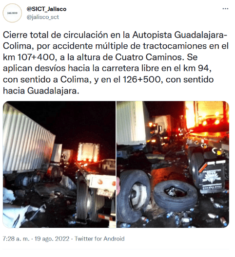 Debido a un choque múltiple en el que participaron siete tractocamiones, la autopista Guadalajara-Colima, se encuentra totalmente cerrada, en ambos sentidos, desde temprana hora de hoy viernes. Según informó el SICT Jalisco en su cuenta de Twitter, el accidente ocurrió en el kilómetro 107+400, a la altura de Cuatro Caminos, en el municipio de Tuxpan. Los conductores están siendo desviados hacia la carretera libre en el kilómetro 94, con sentido a Colima, y en el 126+500, con sentido hacia Guadalajara.De los siete vehículos de carga pesada involucrados en el accidente, seis tuvieron daños notables, y el séptimo con afectaciones leves.De manera preliminar se informó sobre una persona muerta, sin embargo, autoridades no han confirmado esto. Tampoco se ha detallado la causa del accidente, pero cabe resaltar que en la zona hay un banco de niebla.El tráfico está prácticamente detenido, según han reportado usuarios y las mismas autoridades en redes sociales.GC