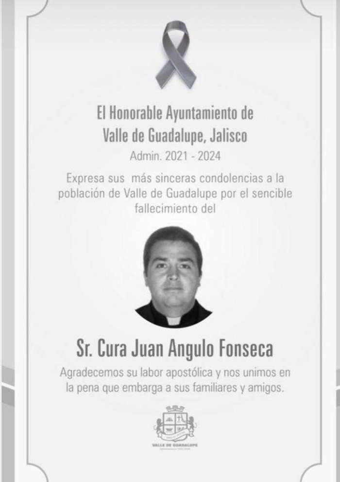 En un predio conocido como rancho La Soledad, fue localizado muerto Juan Angulo Fonseca quien era sacerdote en la parroquia de Nuestra Señora de Guadalupe, en el municipio de Valle de Guadalupe.De acuerdo con los reportes el clérigo habría sido atacado a balazos la tarde del viernes 10 de febrero en la zona perteneciente a la delegación de San Francisco de Asís, del municipio de Atotonilco. En sus redes sociales, el gobierno municipal de Valle de Guadalupe expresó sus condolencias por la muerte del sacerdote."Agradecemos su labor apostólica y nos unimos a la pena que embarga a sus familiares y amigos", publicaron en un mensaje. El prelado ejercía su apostolado en Valle de Guadalupe en marzo de 2017 tras ser nombrado como titular de la parroquia. La Fiscalía del Estado no ha emitido información al respecto para confirmar si se trató de un asesinato, ataque a balazos, posible móvil o detenidos por el hecho.La Diócesis de San Juan de los Lagos, a la que pertenece Valle de Guadalupe, tampoco se ha pronunciado.OF