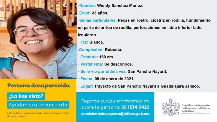 Familiares reportaron la desaparición de Wendy Sánchez Muñoz, de 33 años, quien fue vista por última vez el pasado 9 de enero.De acuerdo con la ficha compartida por su hermano en redes sociales, Wendy desapareció en su trayecto de San Francisco, Nayarit a Guadalajara a las 7 am del 9 de enero. La joven manejaba una camioneta Jeep Cherokee 2015 color blanco.Wendy mide 1.63 m., es de complexión mediana y como señas particulares usa lentes, tiene pecas en el rostro, una cicatriz en la rodilla y perforaciones en el labio inferior del lado izquierdo, además padece diabetes tipo 2.Cualquier información que pueda ayudar a dar con su paradero al teléfono: 33 3837 6000 ext. 161480 / 16141 / 16142 o al 800 640 9280LS