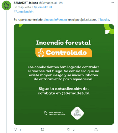 La Secretaría de Medio Ambiente y Desarrollo Territorial de Jalisco (Semadet) informó que en el paraje Escopar, en el municipio de Tapalpa, se registró un incendio en el que actualmente trabajan 30 combatientes.Alrededor de las 11:00 horas, se informó a través de la cuenta de Semadet, en Twitter, sobre el incendio forestal activo."Los combatientes trabajan en controlar el incendio forestal para evitar que el fuego siga propagándose libremente", dice el tuit.Hasta el momento no ha señalado la superficie afectada.Desde ayer otro incendio consumió parte del paraje La Labor, en Tequila; ahí estuvieron más de 10 brigadistas de la Junta Intermunicipal de Medio Ambiente para la Gestión Integral de la Región Valles (JIMAV).A las 10:30, la Semadet detalló que ya estaba controlado el fuego, sin embargo, minutos después se informó que se activó la alerta atmosférica en Tequila y Amatitán por los rezagos y humo que dejó el incendio en la zona de La Labor.Tampoco se detalló el área afectada por el fuego en este predio.GC