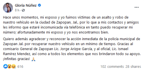 La senadora de Nayarit, Gloria Núñez denunció a través de sus redes sociales que fue víctima de un asalto mientras se encontraba en el municipio de Zapopan, Jalisco. En su mensaje, la legisladora panista detalló que su esposo, que también estaba durante el asalto, y ella se encuentran bien. "Hace unos momentos, mi esposo y yo fuimos víctimas de un asalto y robo de nuestro vehículo en la ciudad de Zapopan, Jal., por lo que a mis contactos y amigos les informo que estaré incomunicada", escribió en su Facebook. Además, también reconoció el trabajo de los elementos de la Policía de Zapopan, que logró recuperar su camioneta en un "mínimo de tiempo". "Quiero además agradecer y reconocer la acción inmediata de la policía municipal de Zapopan Jal. por recuperar nuestro vehículo en un mínimo de tiempo". Núñez no ofreció detalles sobre cuándo o cómo pasó el asalto, pero sí recibió comentarios de apoyo por parte de sus seguidores.Si te interesó esta noticia y quieres saber más, entonces descarga y descubre INFORMAPlus, la aplicación digital de EL INFORMADOR, en donde tenemos contenidos exclusivos, seleccionados por nuestros editores, para darles una experiencia más completa a los lectores.Descarga la aplicación y pruébala GRATIS por treinta días.Para iOS: https://apple.co/35jaVgbPara Android: https://bit.ly/3gwVSEVSi eres suscriptor de EL INFORMADOR tu acceso está incluido, solicítalo al 33 3678-7777GC