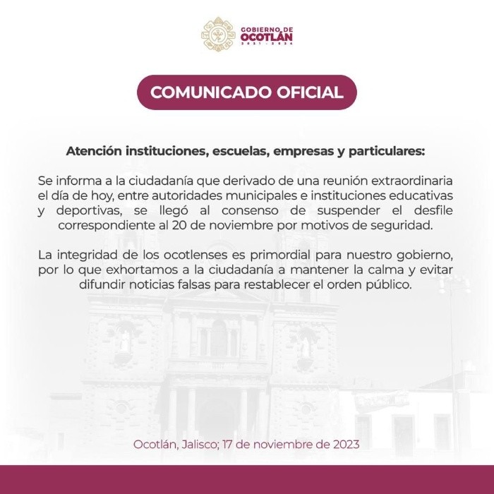 Luego de los hechos violentos ocurridos ayer jueves en el municipio de Ocotlán, donde se enfrentaron criminales armados contra elementos de la Guardia Nacional y la Policía Estatal, dejando como saldo un abatido y una agente lesionada, el ayuntamiento de Ocotlán decidió cancelar el desfile cívico que se llevaría a cabo el próximo lunes 20 de noviembre.“Se informa a la ciudadanía que, derivado de una reunión extraordinaria el día de hoy, entre autoridades municipales e instituciones educativas y deportivas, se llegó al consenso de suspender el desfile correspondiente al 20 de noviembre por motivos de seguridad”, dijo el ayuntamiento a través de un comunicado.Añadió que la decisión fue tomada debido a que “la integridad de las y los ocotlenses” es prioridad, y exhortó a la ciudadanía a mantener la calma y evitar difundir noticias falsas para restablecer el orden público.La decisión de la suspensión del evento se dio pese a que esta mañana el coordinador general estratégico de Seguridad, Ricardo Sánchez Beruben, aseveró que la situación en la Región Ciénega ya estaba normalizada.“Cuando se empiezan a dar los eventos, parte fundamental de lo que hacemos es normalizar la situación, y al momento de normalizar es cuando ya el personal en campo nos dice que no hay ningún reporte que se haya desatendido, que los reportes fueron atendidos, descartados o verificados y en ese momento desde el día de ayer a medio día, una vez que se levantan los bloqueos, queda normalizada la situación. La Región se mantiene, porque la realidad es que hay una comunicación permanente con los presidentes municipales de la Región, con sectores productivos e incluso con sectores eclesiásticos de la Región, quienes nos dicen que poco a poco regresa la normalidad y la calma a la Región desde el día de ayer”, indicó el coordinador.El desfile cívico militar que se realiza el 20 de noviembre a nivel municipal, estatal y federal, data de noviembre de 1928, cuando se realizó un acto deportivo que consistió en una carrera de relevos para celebrar la gesta de 1910.El desfile como acto conmemorativo se realizó por primera vez en 1930, sin embargo, no fue sino a partir del decreto publicado en 1936 por el Senado de la República que se aprobó por fin, establecer al 20 de noviembre como una fiesta nacional, conmemorándola oficialmente con el desfile deportivo.*Mantente al día con las noticias, únete a nuestro canal de WhatsApp aquí: https://whatsapp.com/channel/0029VaAf9Pu9hXF1EJ561i03MV
