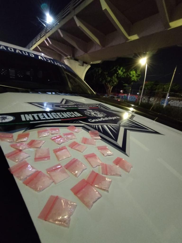 Con el operativo sin fronteras, policías municipales de Guadalajara en coordinación con elementos zapopanos detuvieron a tres hombres con varios envoltorios de droga presunto “cristal”, tras una persecución que terminó en la colonia Conjunto Patria.Oficiales de Guadalajara y Zapopan patrullaban en las inmediaciones de Avenida Ávila Camacho y Avenida Patria, cuando pasaron junto a un Hyundai gris y vieron varios envoltorios en el tablero como lo que se usan para droga sintética, por lo que le marcaron el alto.Los sospechosos no hicieron caso y trataron de escapar pasándose varios semáforos en rojo por Avenida Ávila Camacho, hasta que los oficiales los interceptaron a la altura de Bandera Nacional. En el vehículo viajaban tres hombres, a quienes luego de una inspección conforme al protocolo, les hallaron alrededor de 27 envoltorios con presunta droga “cristal”, por lo que fueron detenidos.Los sujetos dijeron llamarse Francisco Javier “N”, de 48 años; José Emmanuel “N”, de 26 y Francisco Jesús “N”, de 28 y fueron llevados ante el Ministerio Público.FS