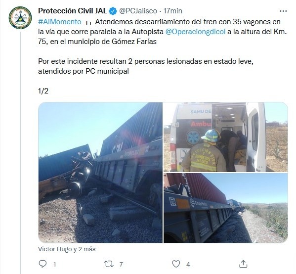 Un tren con 35 vagones se descarriló en la vía que corre paralela a la autopista Guadalajara-Colima a la altura del kilómetro 75, en el municipio de Gómez Farías, informó la Unidad Estatal de Protección Civil y Bomberos de Jalisco (UEPCBJ).Por este incidente, dos personas resultaron lesionadas en estado leve y fueron atendidas por Protección Civil municipal.Según detalló la unidad, el accidente ocurrió por un riel que se abrió, provocando que se unieran las ruedas, lo que causó la volcadura del tren.Los contenedores de los vagones se encuentran cerrados, sin fuga ni derrame de algún material. Este tren cubría la ruta Guadalajara-Manzanillo.JM