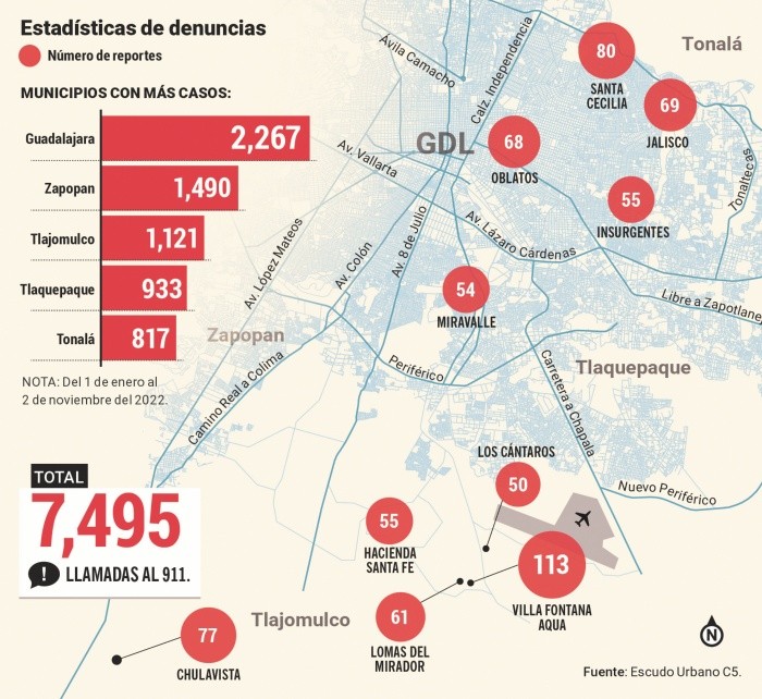 En octubre pasado se registró un enfrentamiento en la colonia Providencia, con saldo de tres muertos, entre ellos Salvador Llamas Urbina, director del Sistema de Agua de Puerto Vallarta y coordinador del Gabinete del alcalde Luis Michel. Además, cuatro personas resultaron lesionadas y en el lugar quedaron casi 100 casquillos. En ese mes también se reportó una balacera en la zona comercial de Puerta de Hierro. Ese hecho dejó un fallecido y seis heridos. Luis Alberto contó que él estaba cerca de un lugar donde venden café, por lo que los trabajadores le recomendaron tirarse al suelo y entrar. “Es muy grave porque te puede tocar una bala perdida… y ni la debes ni la temes”.Estos eventos son cada vez más frecuentes. Tan sólo entre el 1 de enero y el 2 de noviembre de este año, las autoridades han atendido 23 enfrentamientos en Jalisco, según las estadísticas del Escudo Urbano C5 operado por el Gobierno del Estado, en donde se abordan los de alto impacto que, por su relevancia, “requirieron especial seguimiento y participación coordinada de las diversas instituciones de los tres niveles de Gobierno”. La cifra representa un aumento con respecto a 2021, cuando se documentaron 11 enfrentamientos. Y solamente se incluyen municipios con videovigilancia, en la metrópoli, por lo que no se contabilizan balaceras como las ocurridas en zonas limítrofes con otras entidades, como Zacatecas o Michoacán.Según el Catálogo Nacional de Incidentes de Emergencia, el “enfrentamiento de grupos armados se refiere a los conflictos que tienen lugar en el territorio de un Estado entre los civiles, por grupos armados insurrectos, por la portación de armas, cartuchos u otros”.Por otra parte, desde hace tres años los principales eventos de alto impacto que se atienden de forma coordinada mediante el Escudo Urbano C5 son lesionados y occisos por proyectil de arma de fuego. Este tipo de hechos, así como las detonaciones, generan una mayor percepción de inseguridad entre la ciudadanía.Por ejemplo, entre julio y septiembre de 2022, los habitantes del Área Metropolitana de Guadalajara cambiaron sus hábitos por temor a sufrir algún delito: el 66.4% de las personas dejó de llevar cosas de valor, el 58.5% prefirió no caminar de noche en alrededores de su vivienda y el 52.3% no permitió que sus hijos menores salieran de casa.Ante el aumento de eventos violentos en los que se utilizan armas de fuego, algunos ciudadanos que son testigos o que escuchan disparos deciden hacer sus reportes al número de emergencias 911. De acuerdo con estadísticas del Escudo Urbano C5, que aglutina la información al respecto, entre el 1 de enero y el 2 de noviembre de este año se recibieron siete mil 495 reportes por detonaciones de arma de fuego en el Estado (estos hechos no son balaceras de alto impacto como las 23 documentadas en este año, entre éstas las de Providencia o Puerta de Hierro del mes pasado). Por colonia, el fraccionamiento Villa Fontana Aqua, ubicado en Tlajomulco, lidera la estadística con 113 avisos por balazos.Guadalajara y Zapopan fueron las demarcaciones con mayor número de reportes; entre ambas suman tres mil 757 reportes, la mitad de todos los avisos documentados.La segunda colonia con más reportes es Santa Cecilia, en Guadalajara. Entre el 1 de enero y el 2 de noviembre de este año el Escudo Urbano C5 ha recibido 80 avisos de esa colonia, una cifra superior, incluso, que los 71 reportes documentados en todo el municipio de Lagos de Moreno.Esta casa editorial publicó ayer que, pese a un mayor crecimiento en el presupuesto y equipamiento, el Escudo Urbano no ha incidido en que se detengan a más personas o se recuperen más vehículos robados. El comisario jefe de la Policía de Guadalajara, Juan Pablo Sánchez González, afirma que todos los reportes por detonaciones de arma de fuego se atienden de forma oportuna, sin embargo, muchas veces las personas causantes no se localizan porque están al interior del domicilio. “No son tantas detenciones porque las personas huyen del lugar. Se dan a la fuga, pero la Policía de Guadalajara se da a la tarea de localizarlos”.Las colonias tapatías con más reportes por detonaciones de arma de fuego, según el Escudo Urbano C5, son Santa Cecilia (80), Oblatos (68), Insurgentes (55), Miravalle (54), San Andrés (42), Del Fresno (41) y Heliodoro Hernández Loza (41).El comisario jefe de la Policía de Guadalajara, Juan Pablo Sánchez González, dice que algunas sí coinciden con las que concentran el mayor número de afectados. Del Fresno, Oblatos y Echeverría son las que tienen más asesinatos, mientras que Heliodoro Hernández Loza, Santa Cecilia y Bosques de la Cantera la mayor cantidad de lesionados.Al respecto, explica que en esas zonas se impulsa un operativo que se llama Puma. “Participamos verificando lugares y colonias de más incidencia, de casa habitación, para detectar quien porta armas de fuego. También hacemos un operativo mixto en toda la ciudad”.Por otro lado, adelanta que están por anunciar otra campaña de canje de armas encabezada por la Secretaría de la Defensa Nacional (Sedena). “En la cual estaremos participando también nosotros”.