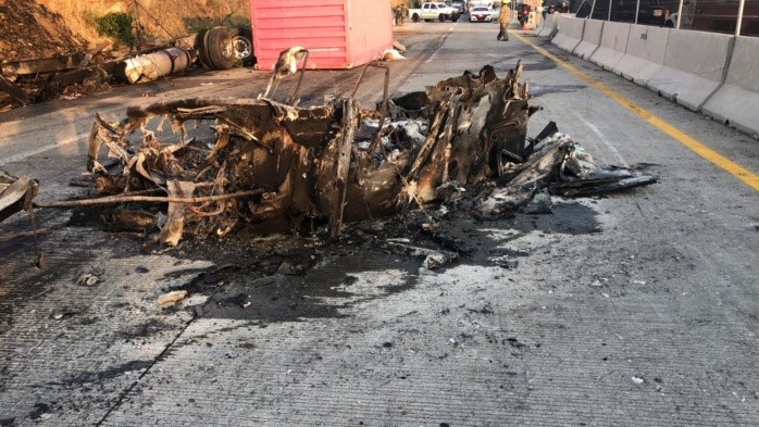 Saldo de una persona fallecida, dejó la volcadura de un tráiler que se accidentó esta madrugada en el Macrolibramiento, a la altura del municipio de Tlajomulco de Zúñiga. La unidad transportaba productos químicos que, debido al percance, quedaron dispersos sobre la carpeta asfáltica.El accidente ocurrió a la altura del kilómetro 45, en dirección de El Arenal a Zapotlanejo. Por causas que aún no han sido determinadas por las autoridades, el tráiler se volcó y se abrió el contenedor.La unidad llevaba sulfato de níquel en bidones de 20 litros, los cuales salieron disparados del contenedor. Varios bidones se rompieron y derramaron su producto sobre la carpeta asfáltica.El tractocamión se incendió y por desgracia el conductor quedó atrapado en el interior de la cabina, muriendo calcinado. Por la complexión se trata de un hombre, pero por las condiciones de los restos es difícil determinar otras características.Personal de Protección Civil de Tlajomulco, de la Unidad Estatal de Protección Civil y Bomberos y de Guardia Nacional atendieron la emergencia y ya liberaron parcialmente la vialidad en la zona. A pesar de ello, se sigue presentando en la zona intensa carga vehicular, pues sólo hay un carril de circulación disponible para el tránsito.Se informó que el retiro completo de la unidad siniestrada demorará algunas horas más.FS