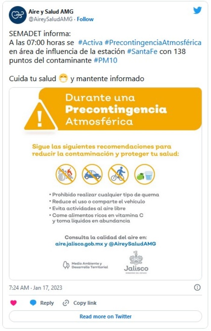 Este martes, la Secretaría de Medio Ambiente y Desarrollo Territorial (Semadet) activó a las 07:00 horas una contingencia atmosférica fase 1 en la zona de influencia de la estación de monitoreo Las Pintas.Lo anterior, informó, debido a que se registraron por más de dos horas consecutivas niveles mayores a los 150 puntos IMECA (Índice Metropolitano de la Calidad del Aire). Al corte de la activación de este episodio de mala calidad del aire, la estación antes mencionada alcanzó los 152 puntos IMECA.Además se activa una precontingencia atmosférica en la zona de influencia de la estación de monitoreo Santa Fe en dónde se registran 138 puntos IMECA.De acuerdo con la Semadet, el contaminante predominante registrado en este momento son las partículas menores a 10 micras (PM10). Las partículas finas en esta temporada se generan principalmente por procesos de combustión como el diésel y la gasolina durante las horas de tráfico, las quemas de predios rústicos y agrícolas, y la suspensión de polvos en las calles. “Cabe mencionar, que las condiciones meteorológicas presentes al momento, favorecen la acumulación de contaminantes atmosféricos durante las noches y madrugadas, lo que permite que se generen episodios de mala calidad del aire como los presentes”, explicó la dependencia.Ante la mala calidad del aire, la Semadet pide a la ciudadanía atender las siguientes recomendaciones:JM