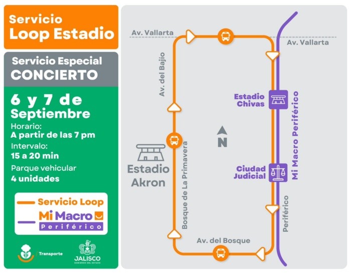 La Secretaría de Transporte Jalisco informó que este 6 y 7 de septiembre se brindará un servicio especial de Mi Macro Periférico con el objetivo de facilitar el ingreso y la salida a las personas que asistan al concierto de Shakira en el Estadio Akron. A partir de las 7:00 pm el servicio de Mi Macro Periférico tendrá un intervalo de paso de 15 a 20 minutos y estarán en funcionamiento un parque vehicular de 4 unidades.Además se extenderá el servicio durante los dos días de conciertos, con las últimas salidas de Carretera a Chapala y de Barranca de Huentitán hasta las 12 de la noche, para que las y los fanáticos de Shakira puedan regresar a sus casas con seguridad una vez terminado el evento. Además, la Policía Vial implementará un operativo especial por los conciertos de La Loba, donde se desplegarán 120 policías viales, 10 patrullas, 10 motopatrullas y 10 ciclopolicias.NA