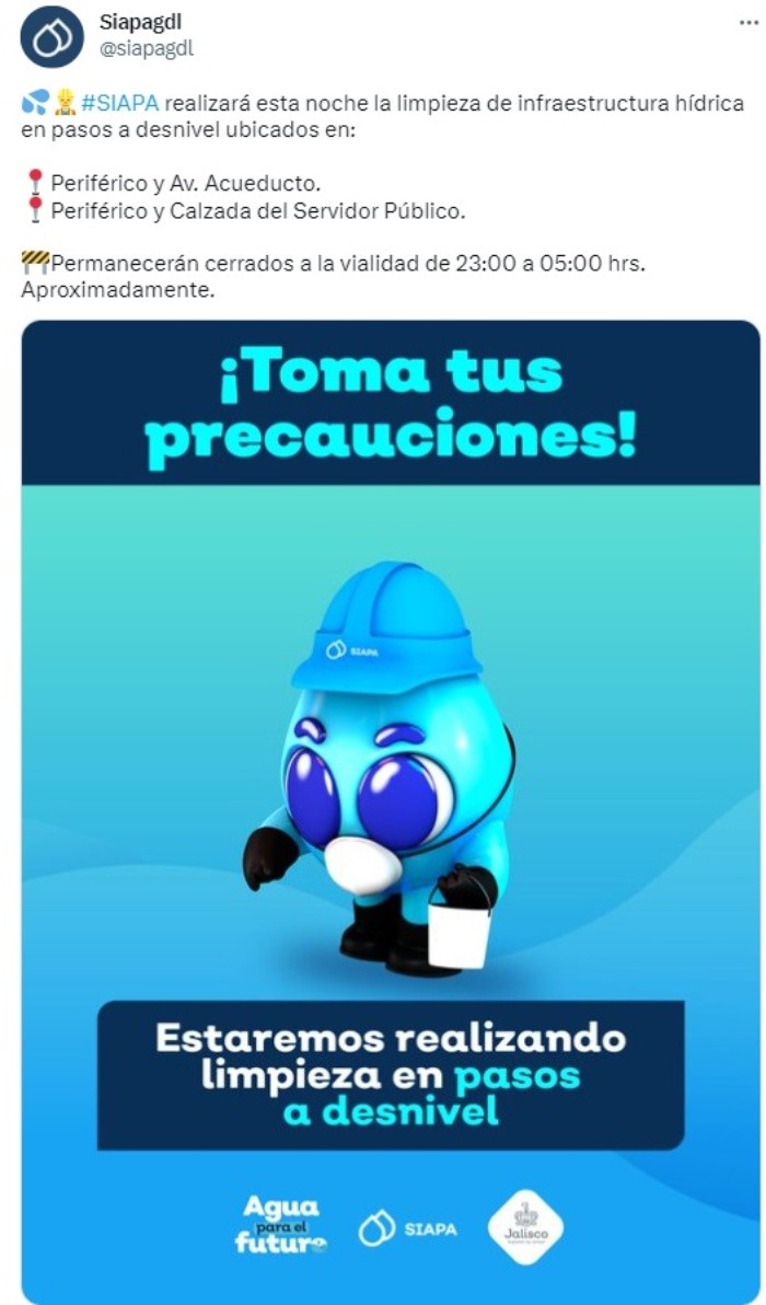 Este martes, el Sistema Intermunicipal de los Servicios de Agua Potable y Alcantarillado (Siapa) informó que continúan con los mantenimientos a los pasos a desnivel que se encuentran en la Zona Metropolitana de Guadalajara (ZMG).Por este motivo hizo un llamado a los ciudadanos para tomar precauciones debido a que habrá cierre vial en dos de ellos. A través de su cuenta de Twitter, el Siapa informó que la noche de este martes se realizará limpieza de infraestructura hídrica en el paso a desnivel ubicado en Periférico y Av. Acueducto, al igual el que está ubicado en Periférico y Calzada del Servidor Público.Ambos permanecerán cerrados a partir de las 23:00 horas hasta las 05:00 de la mañana del miércoles. En caso de tener cualquier duda o aclaración, el Siapa pone a disposición los siguientes medios para que resuelvas tus preguntas.MF