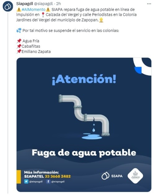 El Sistema Intermunicipal de los Servicios Agua Potable y Alcantarillado (Siapa) reportó un corte de agua en algunas colonias del municipio de Zapopan debido a una reparación de una fuga.A través de sus redes sociales, el Siapa informó que ya se encuentran reparando la falla que se presentó en Calzada del Vergel y calle Periodistas en la Colonia Jardines del Vergel del municipio de Zapopan. Por este motivo se suspenderá el servicio de agua en estas seis colonias del municipio: Se espera que el servicio de agua se restablezca durante la tarde del sábado 9 de septiembre. Para cualquier duda o aclaración, el Siapa pone a disposición los siguientes medios para que resuelvas tus preguntas.MF