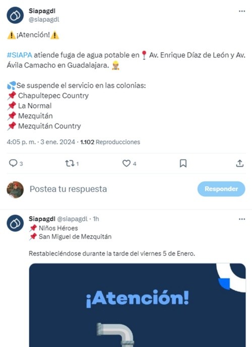 La tarde de este miércoles, el Sistema Intermunicipal de los Servicios Agua Potable y Alcantarillado (Siapa) informó a los usuarios que habrá corte de agua en algunas colonias del municipio de Guadalajara. A través de las redes sociales, el Siapa reportó que se encuentra en reparación una fuga de agua potable sobre la Av. Enrique Díaz de León y Av. Ávila Camacho en Guadalajara. Por tal motivo se verán afectadas con el servicio de agua potable seis colonias de dicho municipio; te decimos cuáles son: Se espera que el servicio de agua se restablezca durante la tarde del próximo viernes 5 de enero.Ante cualquier duda o aclaración, el Siapa pone a disposición los siguientes medios para que resuelvas tus preguntas.MF