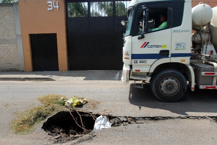 En la calle Piedra del Sol en Las Pomas, Tlaquepaque, a 250 mts de Camino Real, la calle se abrió y ahora hay tres socavones de hasta 2.5 metros de diámetro y dos de profundidad que la adornan.Por esta baja el agua de lluvia que se acarrea desde Bugambilias y, hasta hace aproximadamente seis años, no había problemas, pero el ayuntamiento de San Pedro Tlaquepaque decidió meter tubería en medio de la calle.De acuerdo con vecinos del lugar, hace dos años, antes de pavimentar el lugar, ya se había abierto la calle.Pero también, por los mismos socavones se provocaron otros más.Un camión pasó por el primero, se hundió y lo tuvieron que sacar con maquinaria. Pero cuando ingresó la maquinaria sumió un pedazo de la calle que ya estaba blando y provocó otro bache.Además, el camión no ha sido el único afectado por los hoyos que se encuentran a media calle. Hace unos días un hombre viajaba en su bicicleta cuando una llanta se atoró y salió volando.Mientras que cuando personal del ayuntamiento fue a revisarlos les “recomendó” a los vecinos que todos en la colonia hicieran reportes para que les “hicieran caso” y volvieran a repararlos.LS