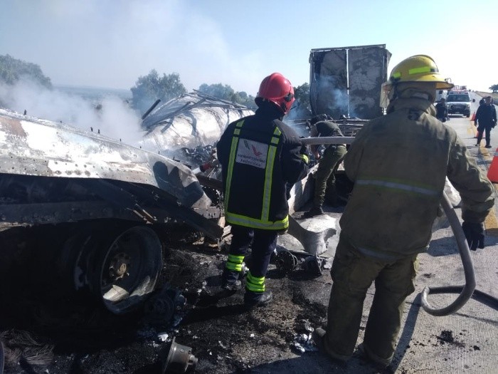 Sobre la autopista Lagos- Ojuelos se registró el incendio de un vehículo de carga pesada que transportaba maquinaria para automóviles, el cual ya consumido en su totalidad se impactó con un vehículo de doble remolque cargado con maíz.Elementos de Protección Civil y Bomberos Jalisco y municipales acudieron al lugar para sofocar el incendio y apoyar con abastecimiento de agua y trabajos de enfriamiento.El suceso ocurrió por la mañana de este viernes sobre el km 40 de la autopista Lagos- Ojuelos. Autoridades indicaron que el conductor no se encontró en el lugar de los hechos por lo que se están haciendo las investigaciones pertinentes. JB