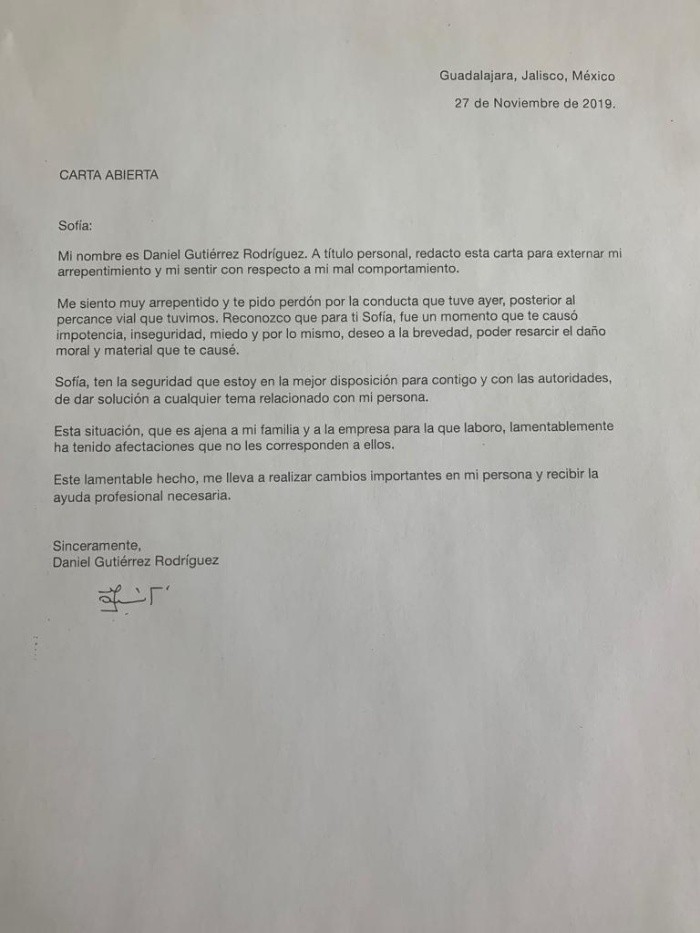 Luego de que una mujer divulgara en redes sociales un video en el que muestra cómo un sujeto patea su auto y le arroja café tras sufrir un percance vial, las reaciones por parte de usuarios de redes sociales no se hicieron esperar.Es así que, en cuestión de horas, dos talleres automotrices se ofrecieron para arreglar sin costo el auto de Sofi, el cual quedó con abolladuras tras la agresión ocurrida este martes.Por un lado, la empresa PITS Auto Spa pidió apoyo a sus seguidores para ubicar a Sofi, pues se mostró interesada en "quitarle el mal rato" que pasó mediante el arreglo gratuito de su auto.Asimismo, DEGO Automotriz se mostró igualmente interesado en brindar su ayuda gratuita a Sofi, y solicitaron que, si alguien la conoce, le haga saber su disposición para cooperar.Entretanto, la Fiscalía de Jalisco continúa con las indagatorias del caso y ya se puso en contacto con la afectada para seguir los procedimientos que marca la Ley.A través de una supuesta carta abierta firmada a nombre de Daniel Gutiérrez Rodríguez, el agresor ofreció disculpas a Sofi por su actitud violenta, y aseguró sentirse “muy arrepentido” por su conducta.En el comunicado, el sujeto dijo estar dispuesto a cooperar con la afectada y con las autoridades para solucionar cualquier conflicto relacionado con su persona.Además, exculpó a la empresa para la que labora, ya que “esta situación…lamentablemente ha tenido afectaciones que no les corresponden a ellos”.El hombre finaliza su carta asegurando que buscará “recibir la ayuda profesional necesaria”.JM