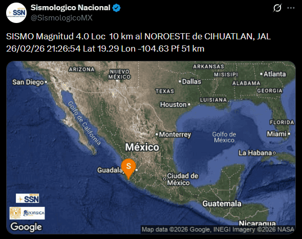 De acuerdo con información del Servicio Sismológico Nacional, el movimiento telúrico ocurrió a las 21:26:54 horas del 26 de febrero de 2026, con epicentro localizado a 10 kilómetros al noroeste de Cihuatlán.