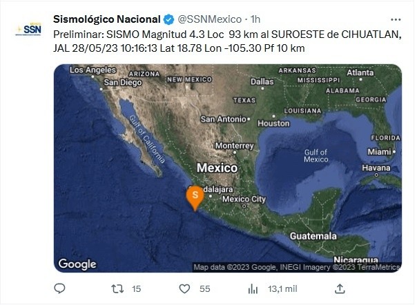 De acuerdo con información del Sismológico Nacional, el sismo ocurrió a las 10:16 de la mañana de este domingo a 93 kilómetros al suroeste de Cihuatlán, Jalisco.