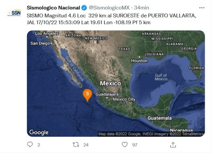 La tarde de este lunes se registró un sismo en Puerto Vallarta a las 15:53 hora local, con una magnitud de 4.6 grados y una profundidad de cinco kilómetros, señalan reportes preliminares.De acuerdo con información preliminar del Servicio Sismológico Nacional (SSN), el epicentro del temblor se ubicó 329 kilómetros al suroeste de Puerto Vallarta.De momento no se registran reportes de mayores afectaciones en el área, y el sismo apenas fue perceptible para la población, por lo que sólo se espera el reporte final de Protección Civil Jalisco.JM