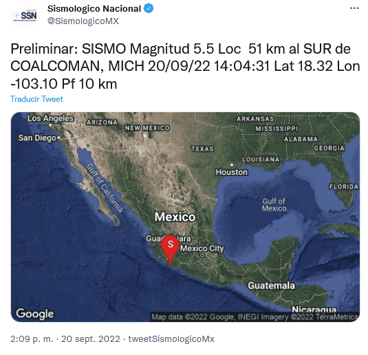 El Servicio Sismológico Nacional (SSN) reportó un nuevo sismo de magnitud preliminar de 5.5 a 51 kilómetros al SUR de Coalcomán, Michoacán, a las 14:04 horas.Posteriormente, el SSN ajustó a magnitud de 5.4El fenómeno fue perceptible en diversos puntos de Jalisco.La Presidencia Municipal de Guadalajara fue evacuada con orden por parte de servidoras y servidores públicos, y visitantes, informaron autoridades.Las unidades de Protección Civil y Bomberos realizan en estos momentos recorridos por la ciudad para descartar daños o afectaciones.En momentos más información...OF