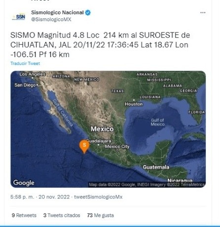 El Sismológico Nacional reportó un sismo de magnitud 4.8, localizado a 214 kilómetros al suroeste de Cihuatlán, Jalisco. De momento la Unidad de Protección Civil y Bomberos de Jalisco reportó que no hay daños.Según el Sismológico Nacional, el temblor se registró a las 17:36 horas de este domingo en una latitud 18.67 y longitud -106.51 con profundidad de 16 kilómetros.El área de comunicación de Bomberos del Estado detalló que en la comandancia de la región costa sur, no fue perceptible e investigan daños.Cualquier situación de riesgo la dependencia informará a través de sus fuentes oficiales.