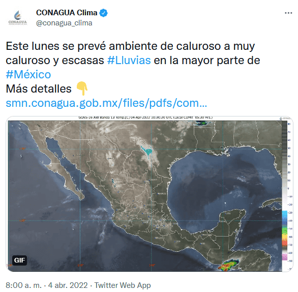 La Comisión Nacional del Agua (Conagua) pronostica que para este lunes, la onda de calor mantendrá el ambiente vespertino de caluroso a muy caluroso y escasa probabilidad de lluvia sobre la mayor parte del territorio nacional. En Jalisco, el organismo prevé una temperatura máxima de 40 grados.Se prevén temperaturas máximas de 40 a 45 grados Celsius en Campeche, Guerrero, el norte de Hidalgo, el centro y sur de Michoacán, Morelos, el norte de Oaxaca, San Luis Potosí, Tamaulipas, el norte y sur de Veracruz y Yucatán.Temperaturas máximas de 35 a 40 grados Celsius se esperan en Chiapas, el este de Coahuila, Colima, el suroeste del Estado de México, noreste de Guanajuato, centro y sur de Jalisco, Nayarit, Nuevo León, norte y suroeste de Puebla, Querétaro, Quintana Roo, Tabasco y Sinaloa, y máximas de 30 a 35 grados Celsius en Aguascalientes, el norte de Baja California, noreste de Chihuahua, este de Durango, Sonora y Zacatecas.Debido a las altas temperaturas que se pronostican para este lunes, se recomienda a la población evitar la exposición prolongada a la radiación del sol, hidratarse adecuadamente, poner especial atención a enfermos crónicos, niños y adultos mayores, así como atender las indicaciones de las autoridades del sector Salud y de Protección Civil de su localidad.Por otra parte, una vaguada polar que recorrerá la zona fronteriza del norte de México en interacción con la corriente en chorro, generarán rachas fuertes de viento con posibles tolvaneras o torbellinos en los estados del norte y noreste del país, se prevén rachas de viento de 70 a 80 kilómetros por horas (km/h) con tolvaneras o torbellinos en Chihuahua, Coahuila, Durango, Nuevo León, San Luis Potosí, Tamaulipas y Zacatecas.Asimismo, se prevé viento con rachas de 60 a 70 km/h y tolvaneras en Aguascalientes, Guanajuato y Jalisco, y viento de componente sur (Surada) con rachas de 60 a 70 km/h en las costas de Campeche, Chiapas, Quintana Roo, Tabasco, Tamaulipas, Veracruz y Yucatán.OA