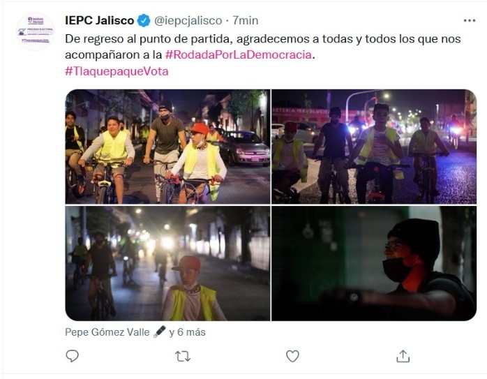 Con una rodada, el Instituto Electoral y de Participación Ciudadana (IEPC) busca fomentar el voto en la elección extraordinaria a celebrarse el 21 de noviembre en Tlaquepaque.Carlos Aguirre, director de Participación Ciudadana del Instituto, señaló que el recorrido se realizó por Boulevard Marcelino García Barragán hacia Niños Héroes para entrar al Centro de Tlaquepaque e ir perifoneando para atraer votantes.“Queremos elevar el nivel de participación ciudadana que hubo en la pasada elección, que fue de 40%. Buscamos que en la próxima elección, del 21 de noviembre, con este tipo de acciones pudiera hacer algún tipo de ruido y vayan a votar”, expresó.Alrededor de 25 personas salieron en bicicleta y con chalecos fluorescentes en los que se leía “A votar, otra vez”.Aguirre señaló que desde el Instituto han hecho más acciones en las últimas dos semanas con el mismo fin, en tianguis y dialogando con la ciudadanía por ejemplo, en las colonias donde detectaron menos número de participación, como en La Mezquitera, San Pedrito y Las Huertas.“Vemos a la ciudadanía bien y creemos con ganas de participar en la fiesta de la democracia. En estas zonas la participación fue de alrededor de 40% en la pasada elección, mientras que el promedio fue de 47”, añadió. Por ello buscan abarcar varias colonias en equipos.Las elecciones se realizarán luego de que el Tribunal Electoral del Poder Judicial de la Federación (TEPJF) anulara las elecciones en el municipio por concluir que el cardenal emérito, Juan Sandoval Íñiguez, interfirió en la votación del 6 de junio. En esta, la candidata de Movimiento Ciudadano, Citlalli Amaya, obtuvo el triunfo.JM