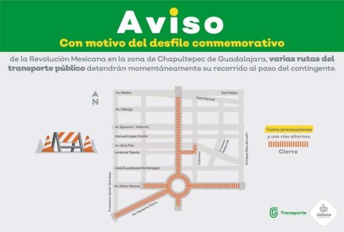 Con motivo del desfile conmemorativo de la Revolución Mexicana, que se llevará a cabo mañana lunes 20 de noviembre, a partir de las 6:00 de la mañana, habrá cierre total de las calles que convergen en la Glorieta de los Niños Héroes y la avenida Chapultepec.Por ello, informó la Secretaría de Transportes (Setran), algunas rutas del transporte público modificarán su recorrido, únicamente durante el paso de los contingentes.Entre ellas se encuentran las rutas T10, T10-C01 Briseño y T10-C02 Miramar, que en su trayecto de ida circularán por la avenida Mariano Otero, continuarán por Circunvalación Agustín Yáñez, seguirán por la avenida Enrique Díaz de León y en Pedro Moreno continuarán con su ruta.En su trayecto de regreso, de la calle Morelos se desviarán en la avenida Enrique Díaz de León, seguirán por Circunvalación Agustín Yáñez, después lo harán por Pedro Moreno para continuar su recorrido normal.Las rutas T09-C1 y T09-C2 al circular por la avenida Unión, iniciarán su desvío en Circunvalación Agustín Yáñez, seguirán por la avenida Enrique Díaz de León, luego por la avenida Niños Héroes y terminarán con su ruta acostumbrada.En sentido inverso, al transitar por la avenida Niños Héroes, continuarán por la avenida Enrique Díaz de León, después por Circunvalación Agustín Yáñez, luego en la avenida Unión seguirán su trayecto habitual.Respecto a las rutas C74 y C127, que de circular por su ruta por la avenida Niños Héroes, se desviarán en Circunvalación Agustín Yáñez, seguirán por la avenida Enrique Díaz de León, después tomarán la avenida Niños Héroes para retomar su ruta.En sentido contrario, al circular por su ruta en la avenida Niños Héroes, se desviarán en la avenida Enrique Díaz de León, continuarán por Circunvalación Agustín Yáñez para terminar con su recorrido habitual en la avenida Niños Héroes.Por su parte, las rutas C66, C124, T11A, T11A-C01, T11A-C02 y T11A-C03 en su recorrido por la avenida Niños Héroes, continuarán por la avenida Enrique Díaz de León, tomarán Libertad donde seguirán su ruta normal.En su recorrido de regreso, al venir por la avenida La Paz seguirán por la avenida Enrique Díaz de León, después lo harán por la avenida Niños Héroes donde continuarán su derrotero ordinario.A su vez las rutas C104, C109, C110 Nuevo México – Chori y C110 Primavera – Venta, que al circular por la calle Morelos, se desviarán por la avenida de Las Américas, seguirán por avenida México, después por la calle Juan Manuel, luego tomarán Progreso para continuar por Pedro Moreno su ruta.En el sentido inverso, vendrán por Morelos, continuarán su desvío por la calle Colonias, luego por José Clemente Orozco, tomarán San Felipe, después la avenida México, seguirán por avenida de las Américas y en la calle Morelos proseguirán con su ruta normal.Las rutas C139 y C140, que al circular por López Cotilla, se desviarán en avenida Unión, continuarán en avenida de las Américas, después tomarán avenida México, seguirán por la calle Juan Manuel, luego Progreso, para continuar con su ruta normal en López Cotilla.En sentido contrario, al circular por la avenida Ignacio L. Vallarta, continuarán por la calle Colonias, seguirán por José Clemente Orozco, luego tomarán San Felipe, después la avenida México, posteriormente la avenida de las Américas/Unión y en avenida Vallarta seguirán su ruta.Las rutas del SiTren L1 y L3, en su trayecto de ida por avenida Vallarta, se desviarán por la calle José Clemente Orozco, después por San Felipe, seguirán por avenida México, continuarán por la avenida de las Américas/Unión y en la avenida Vallarta retomarán su derrotero habitual.En su trayecto de regreso, vendrán por avenida Hidalgo, se desviarán en avenida Unión/Américas, seguirán por avenida México, después tomarán la calle Juan Manuel, luego la calle Progreso para retomar su ruta en la avenida Hidalgo.Por último, la ruta C34, que circula sobre avenida La Paz, continuará por Colonias para retornar por la misma vía y circular por la calle Libertad para seguir su derrotero habitual.Se invita a la ciudadanía a considerar dichas modificaciones para que pueda acudir a sus destinos a tiempo y con las menores complicaciones posibles.*Mantente al día con las noticias, únete a nuestro canal de WhatsApp aquí: https://whatsapp.com/channel/0029VaAf9Pu9hXF1EJ561i03MV