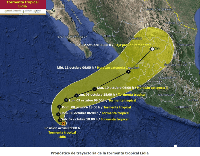 La tormenta tropical "Lidia" continúa su evolución en el Océano Pacífico y tendrá impacto en el estado de Jalisco con lluvias, informó en un aviso el Servicio Meteorológico Nacional (SMN), fuente oficial del Gobierno de México.La situación actual de "Lidia" es que tiene una amplia circulación que ocasionará lluvias muy fuertes a puntuales intensas, viento fuerte y oleaje elevado en Baja California Sur y estados del Pacífico Central Mexicano. "Lidia" se encuentra a 780 km al sur-suroeste de Cabo San Lucas, Baja California Sur, y a 835 km al oeste-suroeste de Cabo Corrientes, Jalisco.Mantiene vientos máximos sostenidos de 100 km/h y rachas de 120 km/h. Su desplazamiento actual es hacia el oeste-noroeste (300°) a 7 km/h."Lidia" mantiene su categoría como tormenta tropical y sería hasta el martes 10 de octubre cuando podría convertirse en huracán, justo cuando se encuentre frente a costas de Jalisco.Las autoridades pidieron extremar precauciones a la población en general en las zonas de los estados mencionados por lluvias, viento y oleaje (incluyendo la navegación marítima) y atender las recomendaciones emitidas por las autoridades del Sistema Nacional de Protección Civil, en cada entidad.Con información del Servicio Meteorológico NacionalOA