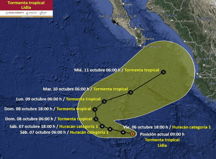 Un huracán se aproxima a Jalisco. Se trata de la tormenta tropical "Lidia" que tuvo un giro en su trayectoria y se dirige a la Entidad, lo que ocasionará lluvias fuertes para la región, según informó el Servicio Meteorológico Nacional (SMN), fuente climática oficial del Gobierno de México, en un aviso este viernes 06 de octubre.Según su más reciente reporte, la tormenta tropical "Lidia" se intensifica gradualmente. Su circulación genera chubascos en Baja California Sur y refuerza la probabilidad de lluvias fuertes a muy fuertes en el noroeste y occidente del país.El sistema está a 695 km al oeste-suroeste de Manzanillo, Colima, y a 710 km al sur de Cabo San Lucas, Baja California Sur. Su desplazamiento es hacia el oeste-noroeste (295°) a 7 km/h y mantiene vientos máximos sostenidos de 110 km/h y rachas de 140 km/h.El pronóstico del SMN es que la extensa circulación de "Lidia" ocasionará intervalos de chubascos (5 a 25 mm) en Baja California Sur, además de reforzar la probabilidad de lluvias muy fuertes (50-75 mm) en Sinaloa y Nayarit, así como lluvias fuertes (25 a 50 mm) en Jalisco.Además, pidió extremar precauciones a la población en general en las zonas de los estados mencionados por lluvias, viento y oleaje (incluyendo la navegación marítima) y atender las recomendaciones emitidas por las autoridades del Sistema Nacional de Protección Civil, en cada entidad.La intensidad de "Lidia" lo llevaría a alcanzar la categoría 1 como huracán este mismo viernes, cuando se localice a 700 km al oeste-suroeste de Playa Perula, Jalisco.Con información del Servicio Meteorológico NacionalOA