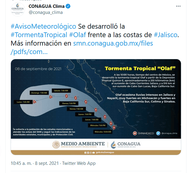 La tormenta tropical ''Olaf'' se formó en las últimas horas en el Pacífico mexicano, frente a las costas de Jalisco, y generará fuertes lluvias en varias regiones del occidente, según informó este miércoles el Servicio Meteorológico Nacional (SMN)."A las 10:00 hora local, tiempo del centro de México, se desarrolló la tormenta tropical 'Olaf' a partir de la depresión tropical Quince-E", indicó el organismo en un boletín.El fenómeno se sitúa aproximadamente a 255 kilómetros al suroeste de Cabo Corrientes, en el estado de Jalisco, y a 510 kilómetros al sur-sureste de Cabo San Lucas, Baja California Sur.El sistema tiene vientos máximos sostenidos de 65 kilómetros por hora (km/h), rachas de 85 km/h, y se desplaza hacia el noroeste a 11 km/h.'''Olaf'' ocasiona lluvias puntuales intensas (de 75 a 150 milímetros (mm)) en los estados de Jalisco y Nayarit; muy fuertes (de 50 a 75 mm) en Michoacán, y fuertes (de 25 a 50 mm) en Baja California Sur, Colima y Sinaloa.Así como rachas de viento de 60 a 70 km/h y oleaje de 2 a 4 metros de altura en las costas de Baja California Sur, Colima, Jalisco, Michoacán y Nayarit."El Servicio Meteorológico Nacional (SMN) de la Comisión Nacional del Agua (Conagua), en coordinación con el Centro Nacional de Huracanes de Miami, mantiene zona de vigilancia por efectos de tormenta tropical desde Los Barriles hasta Santa Fe, ambas localidades de Baja California Sur", apuntó el texto.Las precipitaciones podrían generar deslaves, incremento en los niveles de ríos y arroyos, y desbordamientos e inundaciones en zonas bajas, apuntó el SMN, que pidió a la ciudadanía seguir las recomendaciones de Protección Civil."A la navegación marítima en las inmediaciones del sistema se le hace un llamado a extremar precauciones por vientos y oleaje frente a las costas de los estados mencionados", agregó.Según el pronóstico, el ciclón se moverá en paralelo a las costas mexicanas como tormenta tropical durante varios días y sin llegar a tocar tierra, pero ocasionando lluvias.Hasta el momento en el océano Pacífico se han formado los ciclones ''Andrés'', ''Blanca'', ''Carlos'', ''Dolores'', ''Enrique'', ''Felicia'', ''Guillermo'', ''Hilda'', ''Ignacio'', ''Jimena'', ''Kevin'', ''Linda'', ''Marty'', ''Nora'' y ''Olaf''.Sigue leyendo…Si te interesó esta noticia y quieres saber más, entonces descarga y descubre INFORMAPlus, la aplicación digital de EL INFORMADOR, en donde tenemos contenidos exclusivos, seleccionados por nuestros editores, para darles una experiencia más completa a los lectores.Descarga la aplicación y pruébala GRATIS por treinta días.Si eres suscriptor de EL INFORMADOR tu acceso está incluido, solicítalo al 33 3678-7777OF