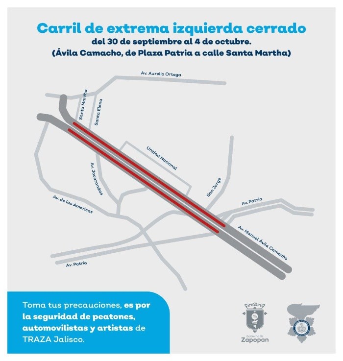 Ante las labores de artistas que pintan las columnas de la Línea 3 del Tren Ligero de Jalisco, autoridades anunciaron hoy cierres viales en la avenida Ávila Camacho, en Zapopan.Desde hoy 30 de septiembre hasta el 4 de octubre por la tarde, estará cerrado el carril central de la avenida Ávila Camacho desde Plaza Patria hasta la calle Santa Martha (poco antes de llegar a la estación de Zapopan Centro de la Línea 3), en ambos sentidos de la circulación.El Gobierno estatal llamó a considerar los tiempos de traslado, pues esta reducción de los carriles puede generar contratiempos en el tráfico.La Comisaría de la Policía Vial mantendrá presencia en los cierres viales para agilizar el tránsito.Como parte del proyecto Traza Jalisco, seis artistas trabajarán en los próximos días en las intervenciones de los pilares de la Línea 3 en Zapopan. El Gobierno estatal estimó que estos trabajos no llevarán más de 4 días.Con Traza Jalisco se intervendrán 110 de las 377 pilares de la Línea 3. El pasado 26 de septiembre los artistas comenzaron a trazar sus ideas en estos espacios.Se prevé que el proyecto de siete etapas concluirá hacia finales de octubre. Cada intervención se ha programado para durar cuatro días e implica la coordinación de Secretaría de Cultura con los municipios de Zapopan, Guadalajara y Tlaquepaque.IM