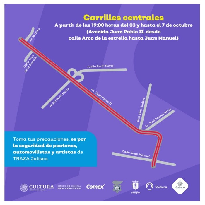 A partir de este sábado se cerrarán los carriles centrales en ambos sentidos de la avenida Juan Pablo II, desde la calle Juan Manuel hasta la calle Arco de la estrella. Esto como parte de los trabajos del programa Traza Jalisco, donde artistas urbanos intervienen algunas columnas de la Línea 3 del Tren Ligero, en Zapopan.La Secretaría de Cultura informó que el cierre será a partir de las 19:00 horas de hoy sábado y se mantendrá durante los próximos cuatro días (hasta el miércoles 7 de octubre), para garantizar la seguridad de peatones, automovilistas y artistas. El pasado 30 de septiembre, el Gobierno estatal anunció el cierre del carril central de la avenida Ávila Camacho desde Plaza Patria hasta la calle Santa Martha, hasta el 4 de octubre por la tarde.En redes sociales, la Policía Vial, que mantiene presencia en los cierres viales para agilizar el tránsito, invitó a considerar el tiempo de traslado y conducir con precaución si se transita por la zona. Además, recordó que hasta mañana se mantendrá cerrado el carril de extrema izquierda.Las obras de Traza Jalisco se desarrollan desde este 25 de septiembre en Zapopan, en este municipio se seleccionaron 32 pilares para plasmar mural-grafiti. Mientras que en Guadalajara y Tlaquepaque donde en los próximos días iniciarán trabajos, se pintarán 56 y 22 pilares, respectivamente. En total serán intervenidas 110 de las 377 columnas de la Línea 3. Se prevé que el proyecto concluya hacia finales de octubre. Cada intervención se ha programado para durar cuatro días.NR
