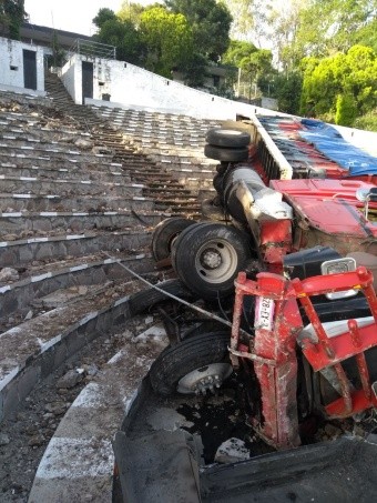 GUADALAJARA, JALISCO.- El chofer de un trailer que al parecer se encontraba bajo el influjo de drogas atravesó el auditorio de la Barranca de Huentitán.Medios locales y Bomberos de Guadalajara informaron que el trailer accidentado era perseguido por las autoridades desde la Calzada Independencia y San Juan de Dios, por donde circulaba a exceso de velocidad rumbo a la Barranca de Huentitán. A su paso por la Calzada Independencia el trailer se impactó contra tres vehículos.Luego de ser perseguido por casi 10 kilómetros el conductor terminó impactando contra el auditorio, que se encuentra justo al borde de la barranca.Debido a la velocidad a la que iba el tráiler se saltó una parte de la entrada del auditorio, aterrizó en las gradas por las que se deslizó y arrasó con una parte de ellas, deteniéndose metros antes de caer por el precipicio.De acuerdo con los informes el chofer del vehículo aseguró que estaba huyendo pues "el diablo lo perseguía". Se desconoce si sufrió lesiones o si fue detenido.
