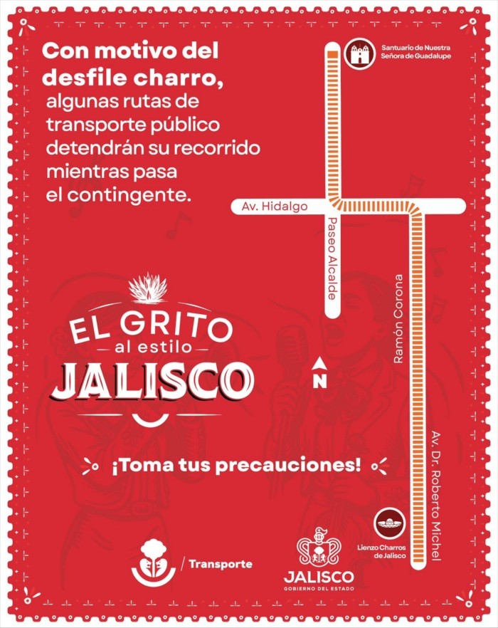 La Secretaría de Transporte Jalisco informó que el próximo domingo 14 de septiembre algunas rutas de camiones detendrán sus recorridos en el municipio de Guadalajara con motivo del tradicional desfile por el Día de la Charrería y por tres carreras deportivas.Para dar paso a las y los participantes del desfile se cerrarán algunas de las principales vialidades del Centro Histórico de Guadalajara como lo son las avenidas Fray Antonio Alcalde, Ramón Corona y Dr. Roberto Michel.Las rutas que se detendrán por dicho desfile serán las siguientes a partir de las 10:45 de la mañana: C15, C15 Reyes Heroles, C17, C47-V1, C47-V2, C48, C52, C67 V1, C67 V2, C83, C86, C87, C109, C111, C111-V3, C112-2, C128A V2, C140, T13A Álamo, T13A Azucena, T13A-4 Arvento, T13A-5 Agaves, T13A-6 Zapote-Aeropuerto, T13A-7 Salto - Centro Metropolitano.T13A-C01 Central de Autobuses, T13A-C02 Cima Serena, T13A-C02 Purísima, T13A-C03 Rancho Alegre, T13A-C03 Silos, T13C-C02 Villas Andalucía, T13B Azucena, T13B Lilas, T13B-1 Jardines, T13B-1 Villas, T13B-C01 Cima Serena, T13B-3 Salto-El Verde, T14A, T14A-C01, T14A-C05.T14B-C02 y T21 Zapotlanejo en la calle Liceo/ Avenida Ramón Corona/ Avenida Roberto Michel, SITREN L3 y V02 de la Ruta López Mateos.El primer evento deportivo se realizará en la colonia Vallarta Norte de Guadalajara, donde para la seguridad de las y los participantes se cerrarán las avenidas México y Juan Palomar y Arias.Será a partir de las 6:30 am cuando los camiones que pasan por las rutas de las tres carreras detendrán sus recorridos.La segunda carrera se realizará en la Colonia del Sur y se cerrarán las siguientes vialidades: Avenida Cruz del Sur, Guatemala, San Salvador, Brazil, Uruguay, Isla Curazao, Isla de Palos, Reyes Catolicos, Isla Indias, La Rábida y la Avenida Cristóbal Colón.Las rutas son: C109, C110 dos vías, C140, C01, C107, C119 Circuito, C123-V1, C123-V2, T06-2, T08-C01, T18 Terranova, T07-C01, SITREN L1, T04A y vías.Finalmente la última carrera se realizará sobre Calzada Lazaro Cardenas y Avenida San Ignacio, por lo que las rutas T04A y T04 Vías se detendrán.NA