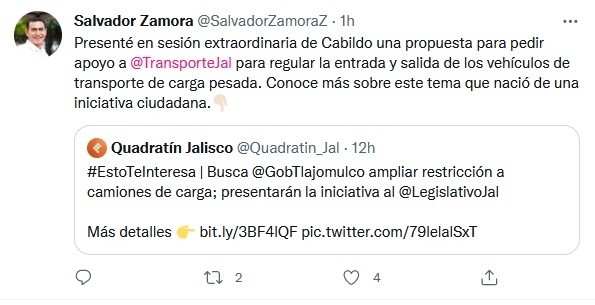 Este lunes, el Ayuntamiento de Tlajomulco de Zúñiga aprobó presentar ante el Congreso del Estado la iniciativa de ampliar dos horas el horario de restricción en la circulación de camiones de carga pesada en los ingresos al Área Metropolitana de Guadalajara (AMG), de modo que la restricción sea de las 6:00 a las 11:00 horas de lunes a domingo, cuando actualmente el horario concluye a las 9:00 horas.De acuerdo con el presidente municipal de Tlajomulco, Salvador Zamora Zamora, esta iniciativa que lleva planteándose desde hace seis años y que será presentada el próximo miércoles ante el Instituto de Planeación y Gestión del Desarrollo (Imeplan), busca garantizar la seguridad vial y a su vez disminuir la emisión de contaminantes para mejorar la calidad de vida sin afectar a la economía. El alcalde exhortó a los demás municipios a sumarse a esta petición.“Es muy importante elevar esta discusión en todos los municipios del Área Metropolitana, el que se pueda elaborar un estudio técnico involucrando a todos los actores económicos, sociales y políticos, para abordar un tema tan importante, porque no solamente se trata de la movilidad, se trata de la seguridad vial, de mejorar la calidad de aire en nuestra ciudad”, declaró.Para ello proponen una reforma a los artículos 71, fracción IX y 71 Ter de la Ley de Movilidad y Transporte del Estado de Jalisco, donde se establecen los lineamientos para su regulación y circulación de este tipo de transportes. A su vez solicitan, que el Imeplan ajuste los lineamientos técnicos generales junto con el mapa de circulación y que implemente arcos de monitoreo con tecnología, para garantizar que se cumpla con restricción en los horarios establecidos.JM