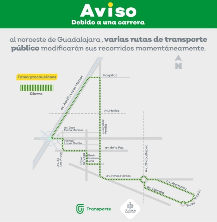 La Secretaría de Transporte Jalisco informó que varias rutas de camiones modificarán sus recorridos y otras los detendrán momentáneamente el próximo domingo 4 de agosto en las principales avenidas de Guadalajara por motivo de una carrera deportiva que comenzará a las 7:00 horas. Las y los participantes tendrán como punto de partida la avenida de La Paz, entre Duque de Rivas y Emilio Castelar. Cabe destacar que las siguientes rutas solo modificarán sus recorridos mientras pasa el contingente, una vez concluida la carrera retomarán su trayecto habitual.La ruta C104, de circular por avenida Vallarta, se desviará por Francisco de Quevedo, después por Circunvalación Agustín Yáñez y seguirá por avenida de los Arcos donde continuará con su derrotero usual.Mientras que las rutas T11A, T11A-C01, T11A-C02 y T11A-C03, de avenida La Paz, seguirán por Francisco de Quevedo, después por Circunvalación Agustín Yáñez y en avenida de los Arcos continuarán con su ruta normal.Por otro lado, las rutas C124 y C136 se desviarán hacia Francisco de Quevedo, después por Circunvalación Agustín Yáñez para continuar su ruta.Las rutas C104, C109, C110 dos vías, C121-A, C121-B y C79, se detendrán en Fernando de Celada, en sentido de Oriente a Poniente, entre avenida Vallarta y avenida Adolfo López Mateos.Mientras que en la avenida Adolfo López Mateos, sentido de sur a norte, entre Fernando de Celada y Hospital, lo harán las rutas C108, C123-V1, C123-V2, C79, SITREN L1, T06-2, T18 López Mateos, T18 Terranova, T22-V02 y T22-V03.Se detendrán en la avenida Circunvalación Agustín Yáñez en sentido oriente a poniente, entre Francisco Javier Gamboa y la avenida Niños Héroes, las rutas C74, T18 López Mateos y T18 Terranova.Por su parte, en la avenida Niños Héroes de poniente a oriente, entre la avenida Circunvalación Agustín Yáñez y la avenida Chapultepec, las rutas C74, C127, T09-C1, T09-C2, T10, T10-C01 y T10-C02.Finalmente, en la calle España de oriente a poniente, entre Suiza y avenida Chapultepec, las rutas C17, T07-C01 y T07-C04.NA