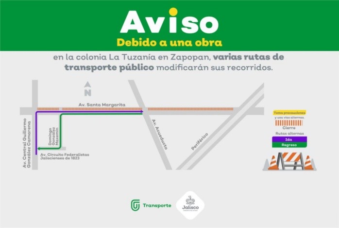 Con motivo de una obra de infraestructura vial sobre la avenida Santa Margarita, entre el Anillo Periférico Poniente y la Calzada del Servidor Público, en la colonia La Tuzanía del municipio de Zapopan, a partir de la noche de hoy lunes 27 de noviembre algunas rutas del transporte público modificarán su camino el tiempo que duren las obras.El Gobierno del Estado informó que de ida, las rutas C54 y MMP- A06 circularán por av. Central Guillermo González Camarena y continuarán por av. Santa Margarita en su ruta habitual, mientras que la MMP-A03 no tendrá modificaciones en el trayecto de ida.En su trayecto de regreso, tanto la ruta C54 como las alimentadoras de Mi Macro Periférico A03 y A06 circularán por avenida Santa Margarita, se desviarán por Domingo González Maxemin, seguirán por avenida Circuito Federalistas Jaliscienses de 1823, y continuarán por la avenida Guillermo González Camarena hasta la terminal.Por último, en esta etapa se permitirá circular en contraflujo vehicular, a las siguientes rutas de transporte público en la zona de cierre: C43 Arco del Triunfo, C54, C72, C84, C85, C85, Base Aérea, C121-B, C135, C140, T08, T08-C02, T16B-C06 La Magdalena, T16B-C07 Vistas, T16B-C08 La Piedrera, T17, T17-1, T17-C01, alimentadoras Mi Macro Periférico A03 y A06. *Mantente al día con las noticias, únete a nuestro canal de WhatsappMF