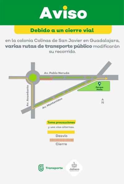 Con motivo del cierre por una obra de renovación de infraestructura en un tramo de la avenida Pablo Neruda, entre av. Acueducto y Paseo del Mirador, en la colonia Colinas de San Javier en Guadalajara, a partir del lunes 16 de octubre algunas rutas del transporte público modificarán su recorrido en el sentido poniente-oriente, el tiempo que dure la obra. Las rutas C64, C65 y C54, que en su trayecto de ida circulan por la avenida Pablo Neruda, se desviarán por la avenida Acueducto, seguirán por avenida Montevideo para continuar después su ruta en la avenida Pablo Neruda. En su trayecto de regreso, realizarán su recorrido habitual.La Secretaría de Transporte (Setran) agradece la comprensión e invita a las y los usuarios a planificar con antelación sus traslados. MV