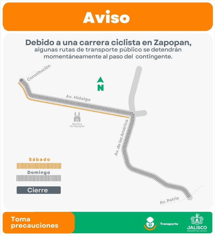 La Secretaría de Transporte Jalisco informó que el próximo sábado 15 y domingo 16 de marzo varias rutas de camiones modificarán sus trayectos, debido a una competencia ciclista en el municipio de Zapopan. La competencia iniciará el sábado 15 de marzo a las 6:00 de la mañana y concluirá a las 6:00 de la tarde; tendrá como punto de partida la avenida Hidalgo en su cruce con la calle Emiliano Zapata, en el centro de Zapopan. Mientras que la segunda etapa de esta competencia iniciará el domingo 16 de marzo a las 7:00 horas en los cruces de la avenida Hidalgo y la calle Emiliano Zapata, donde las y los ciclistas avanzarán hacia el poniente en sentido de la circulación vehicular. La ruta C73, que de ida circula por la calle Sarcófago, se desviará en Libertad y avenida Tesistán para retomar su recorrido. En su trayecto de regreso, de la avenida Tesistán seguirá por Independencia e Industria, para continuar su habitual trayecto.La ruta C72, que de ida va por avenida Tesistán, se desviará en la calle Independencia, Industria y Manuel H. Alatorre para retomar su ruta en la avenida Aurelio Ortega. De regreso tomará por la avenida Aurelio Ortega, Manuel H. Alatorre, Sarcófago, Libertad y retomar su ruta en la avenida Tesistán.La ruta C84, que de ida por Fray Toribio de Motolinía, se desviará por Ramón Corona, después tomará Zaragoza para retornar. De regreso, circulará por Colón, avenida Tesistán, Constitución y, por último, retomará su recorrido en Fray Antonio de Motolinía.La ruta C85 dos vías, que en su trayecto de ida circula por Fray Toribio de Motolinía, se desviará en Ramón Corona y seguirá por Cuitláhuac, Independencia, Industria y carriles centrales de la avenida Juan Pablo II, para retomar su ruta habitual en la avenida Manuel Ávila Camacho. En su trayecto de regreso, de circular por la avenida Manuel Ávila Camacho, tomará la avenida Aurelio Ortega, Manuel H. Alatorre, Sarcófago, Libertad, Nicolás Bravo, Colón, avenida Tesistán y Constitución para luego continuar su recorrido habitual en Fray Toribio de Motolinía.La ruta T08, que circula por avenida Tesistán, se desviarán en la calle Independencia, Industria y carriles centrales de la avenida Juan Pablo II, para seguir por la lateral de esta misma vialidad su ruta acostumbrada. En su recorrido de regreso, de la lateral de la avenida Juan Pablo II se desviarán en la avenida Manuel Ávila Camacho, Santa Rita, avenida Aurelio Ortega, Manuel H. Alatorre, Sarcófago para finalizar su desvío en Libertad y retomar su circulación ordinaria en la avenida Tesistán.La V03 de la Ruta López Mateos, que en su trayecto de ida circula por Avenida de las Américas, se desviará en la avenida Juan Pablo II y se retornará. En su regreso dará vuelta en Javier Mina y tomará la avenida Juan Pablo II, para retomar su ruta en la avenida de las Américas.La V04 de la Ruta López Mateos, que circula por avenida Tesistán, se desviará en la calle Independencia, Industria, Paulino Navarro, y avenida San Jorge para retomar su ruta habitual en la avenida Manuel Ávila Camacho. De regreso, al circular por la Avenida Manuel Ávila Camacho se retornará en la avenida Patria, continuará por la Avenida Manuel Ávila Camacho, Sarcófago y Libertad para retomar su ruta en la avenida Tesistán.Debido a que las rutas T16B-C06 La Magdalena, T16B-C07 Vistas y T16B-C08 La Piedrera no podrán llegar su destino ordinario en Villa Fantasía, al arribar a la calle Constitución continuarán por la calle Ramón Corona para luego retornar en la calle Cuitláhuac y Colón hasta incorporarse a su trayecto habitual por la avenida Tesistán.Las rutas C136, T08-C01, T16A-C01, T16A-C01 Tréboles, T16B, T16B-1, T16B-C01, T16B-C03, T16B-C04 y T16B-C05 solamente modificarán su trayecto de ida, pues al circular por la lateral de la avenida Juan Pablo II, se desviarán al incorporarse a los carriles centrales de la misma vialidad para retomar su recorrido habitual en la avenida Manuel Ávila Camacho.NA